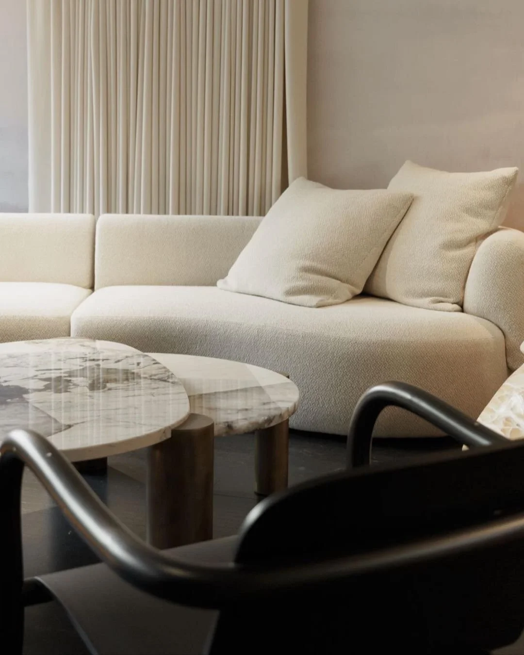 Patagonia Granite and a hand burnished brass base. The interlocking design unites two tables, creating one synchronized structure.