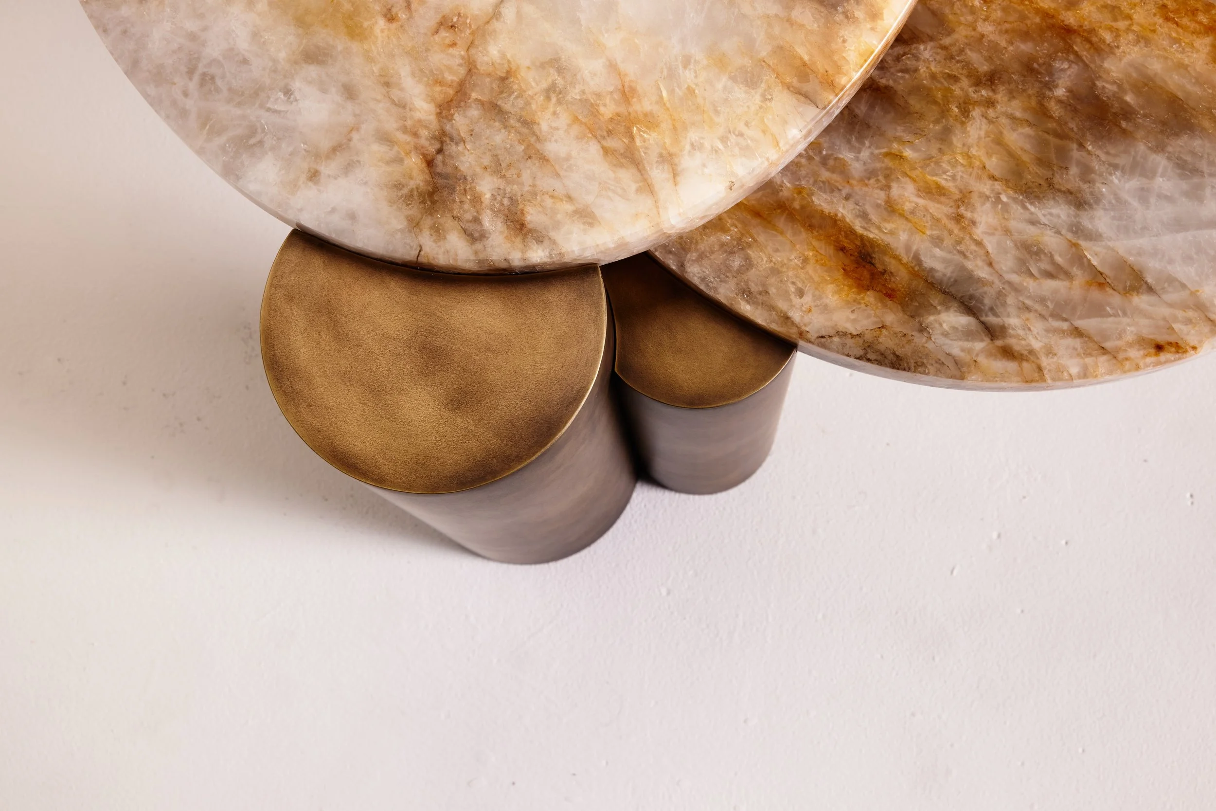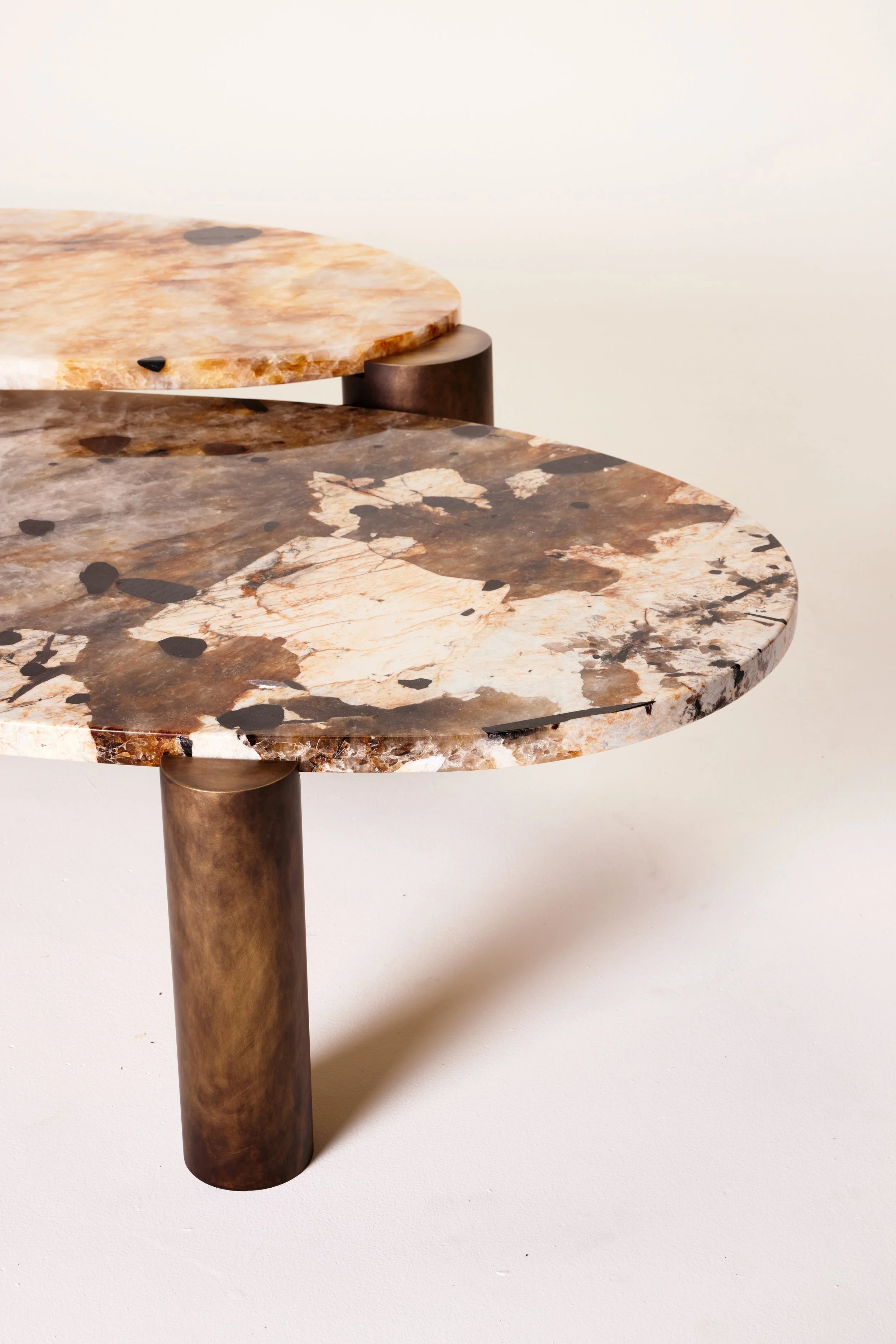 Presenting the Xenolith Long Table, a rendition of the original Xenolith Table with a transformed footprint, stretching gracefully into a long extension. The interplay of stone with an inset table leg system offers customization options and a diverse range of stone selections. The showcased version uses a distinctive one of a king high-crystal Patagonia Granite slab with burnished brass legs.